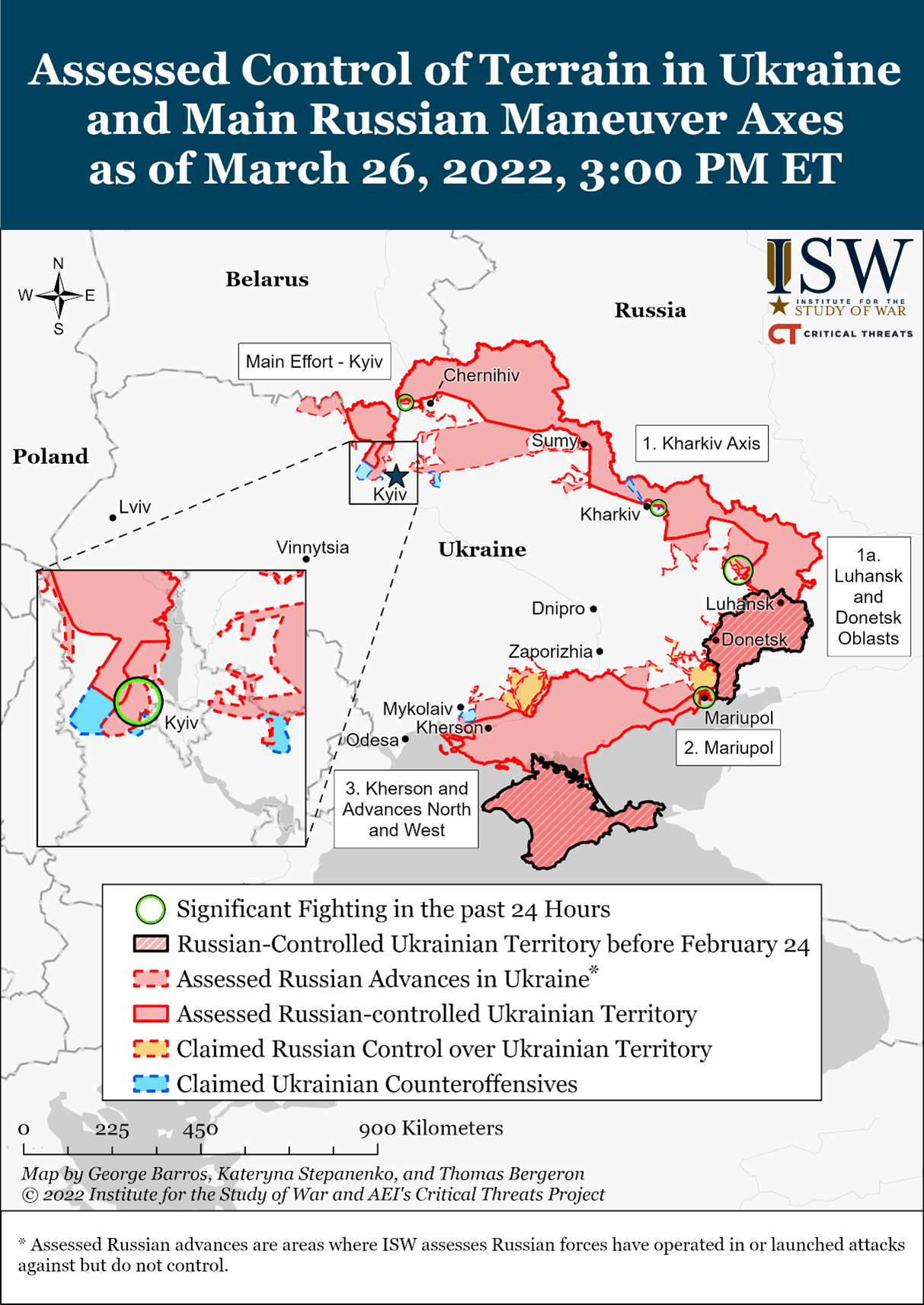Однако, как показывает картограф войны в Твиттере 26.03.2022, т.е. через месяц после начала операции, российские войска сохранили сплоченность на юге, но на СВ и С они были раздроблены, поэтому вблизи Киева а также под Харьковом.