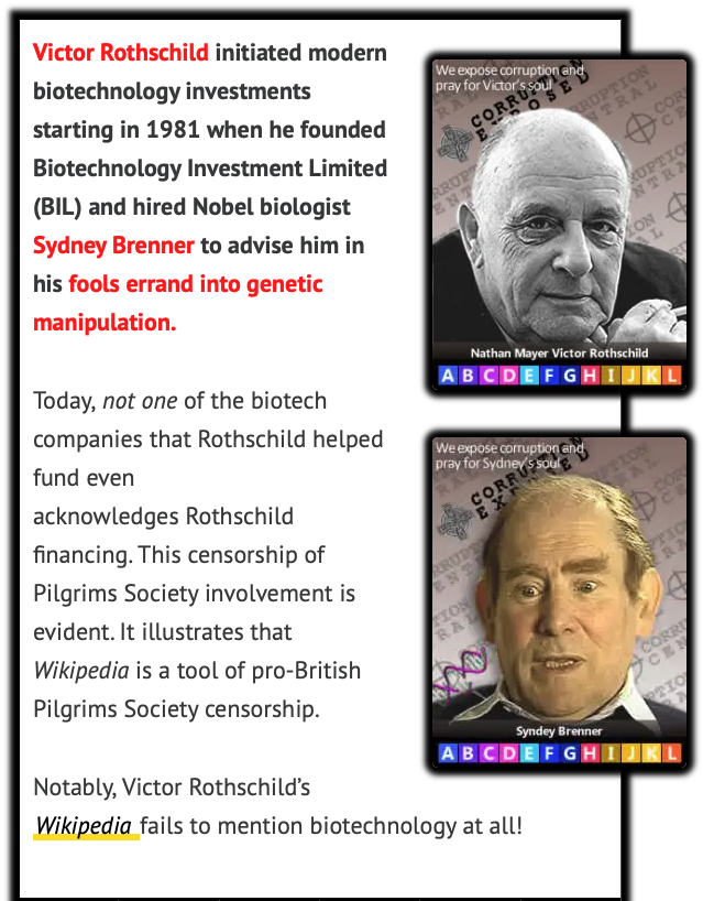 ВИКИПЕДИЯ СКРЫВАЕТ ВСЮ МАСШТАБНУЮ УЧАСТНОСТЬ РОТШИЛЬДА В РАННИХ БИОТЕХНОЛОГИЯХ США.
