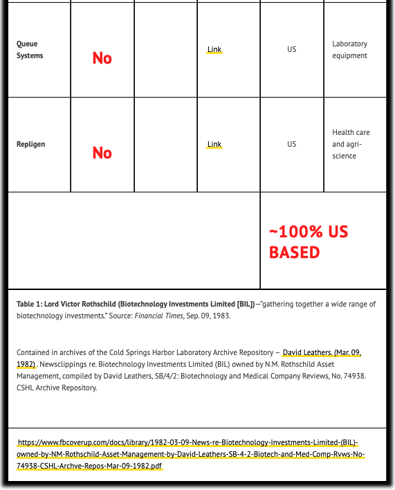 Виктор Ротшильд и его компания NM Rothschild Asset Management основали компанию Biotechnology Investments Limited (BIL) вслед за Комиссией кабинета министров Великобритании, которую он возглавил для реорганизации британских исследований и разработок. Эта инсайдерская торговля дала ему раннее лидерство в создании исследовательских фирм в области биотехнологий, которые первыми начали использовать «новые» продукты для манипуляций с ДНК и даже запатентовали свою безумную науку.