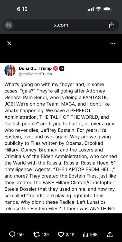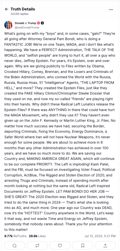 Что происходит с моими «мальчиками», а в некоторых случаях и «девчонками»? Все они нападают на генерального прокурора Пэм Бонди, которая проделывает ФАНТАСТИЧЕСКУЮ РАБОТУ! Мы в одной команде, MAGA, и мне не нравится то, что происходит. У нас ИДЕАЛЬНАЯ администрация, о которой говорит весь мир, а «эгоистичные люди» пытаются ей навредить, и всё из-за человека, который никогда не умрёт, Джеффри Эпштейна. Годами это Эпштейн, снова и снова. Почему мы публикуем файлы, написанные Обамой, коррумпированной Хиллари, Коми, Бреннаном и лузерами и преступниками из администрации Байдена, которые обманули мир с помощью мистификации «Россия, Россия, Россия», 51 агента «разведки», «НОУТБУКА ИЗ АДСКОГО» и многого другого? Они создали файлы Эпштейна, точно так же, как создали ФЕЙКОВОЕ досье Хиллари Клинтон/Кристофера Стила, которое они использовали против меня, и теперь мои так называемые «друзья» играют им на руку. Почему эти радикально-левые безумцы не опубликовали файлы Эпштейна? Если там было ЧТО-ТО, что могло бы навредить движению MAGA, почему они этим не воспользовались? Они даже не отказались от файлов Джона Ф. Кеннеди или Мартина Лютера Кинга-младшего. Каких бы успехов мы ни достигли – в обеспечении безопасности границы, депортации преступников, восстановлении экономики, энергетическом доминировании, построении более безопасного мира, где у Ирана не будет ядерного оружия, – некоторым этого никогда не бывает достаточно. За 6 месяцев мы добьемся большего, чем любая другая администрация за более чем 100 лет, и нам ещё многое предстоит сделать. Мы спасаем нашу страну и ВЕРНЁМ АМЕРИКУ ВЕЛИКОЙ, что останется нашим главным приоритетом. Левые разваливаются! Кэш Патель и ФБР должны сосредоточиться на расследовании фальсификаций на выборах, политической коррупции, движения ActBlue, фальсифицированных и украденных выборов 2020 года и арестовании бандитов и преступников, вместо того, чтобы месяцами изучать одни и те же, вдохновлённые радикальными левыми, документы о Джеффри Эпштейне. ПУСТЬ ПЭМ БОНДИ ДЕЛАЕТ СВОЮ РАБОТУ — ОНА ВЕЛИКОЛЕПНА! Выборы 2020 года были сфальсифицированы и украдены, и они пытались сделать то же самое в 2024 году — именно этим она занимается как генеральный прокурор, и многим другим. Год назад наша страна была МЕРТВА, а теперь она — САМАЯ «ЖАРКАЯ» страна в мире. Давайте оставим всё как есть и не будем тратить время и силы на Джеффри Эпштейна, человека, до которого никому нет дела. Спасибо за ваше внимание к этому вопросу!
