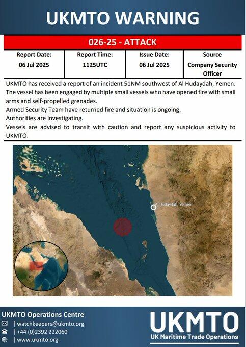 UKMTO получила сообщение об инциденте в 51 км к юго-западу от Ходейды, Йемен. Судно было атаковано несколькими небольшими судами, которые открыли огонь из стрелкового оружия и самоходных гранат. Вооруженная группа безопасности открыла ответный огонь, ситуация продолжается. Власти проводят расследование. Судам рекомендуется проходить транзит с осторожностью и сообщать о любой подозрительной деятельности в UKMTO.