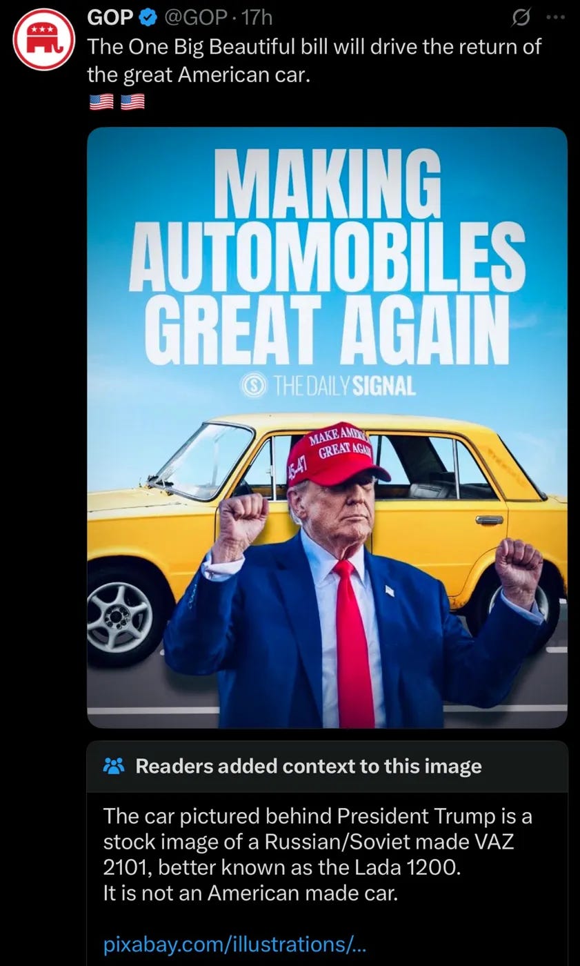 31 июля 2025 года в официальном аккаунте Республиканской партии в Твиттере был опубликован пост, который можно назвать шедевром непреднамеренной иронии. Продвигая «Один большой красивый законопроект» Трампа о возрождении американского автомобилестроения, они разместили изображение Трампа в своей характерной танцевальной позе на фоне ярко-жёлтого автомобиля. Речь идёт о советской «Ладе ВАЗ-2101», выпускавшейся с 1970 по 1988 год, которую, по словам автомобильных экспертов, можно было назвать «наименее американской машиной». Этот российский автомобиль стал официальным символом возрождения американской автомобильной промышленности. Изображение носит водяной знак The Daily Signal, поскольку, по всей видимости, даже консервативные СМИ не могут избежать притяжения этой хронологии, склонной к ироническому противоречию.