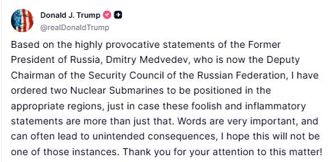 Говоря о России, эскалация Трампа 1 августа напоминает отвергнутый сценарий из «Доктора Стрейнджлава». Сократив срок прекращения огня на Украине с 50 до 10 дней, Трамп оказался втянут в борьбу за «правдивую социальную» с Дмитрием Медведевым, которая менее чем за неделю переросла из дипломатического позирования в ядерное противостояние. Когда Медведев предупредил, что «каждый новый ультиматум — это угроза и шаг к войне», Трамп ответил приказом «разместить две атомные подводные лодки в соответствующих регионах на случай, если эти глупые и провокационные заявления окажутся чем-то большим».