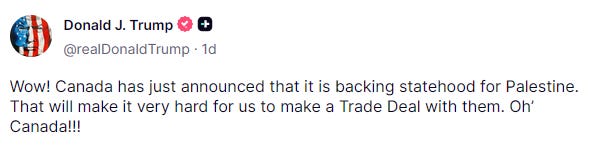 Этот творческий подход к международным отношениям достиг новых высот, когда Трамп открыто связал заявление Канады о поддержке палестинской государственности с торговыми трудностями. 31 июля 2025 года Трамп опубликовал пост: «Ух ты! Канада только что объявила о поддержке государственности Палестины. Это очень затруднит нам заключение с ними торгового соглашения. О, Канада!!!» Это произошло за день до введения 35%-ных пошлин, очевидно, потому, что наши северные соседи совершили непростительный грех, последовав примеру Франции и Великобритании и признав Палестину на фоне гуманитарного кризиса в секторе Газа.
