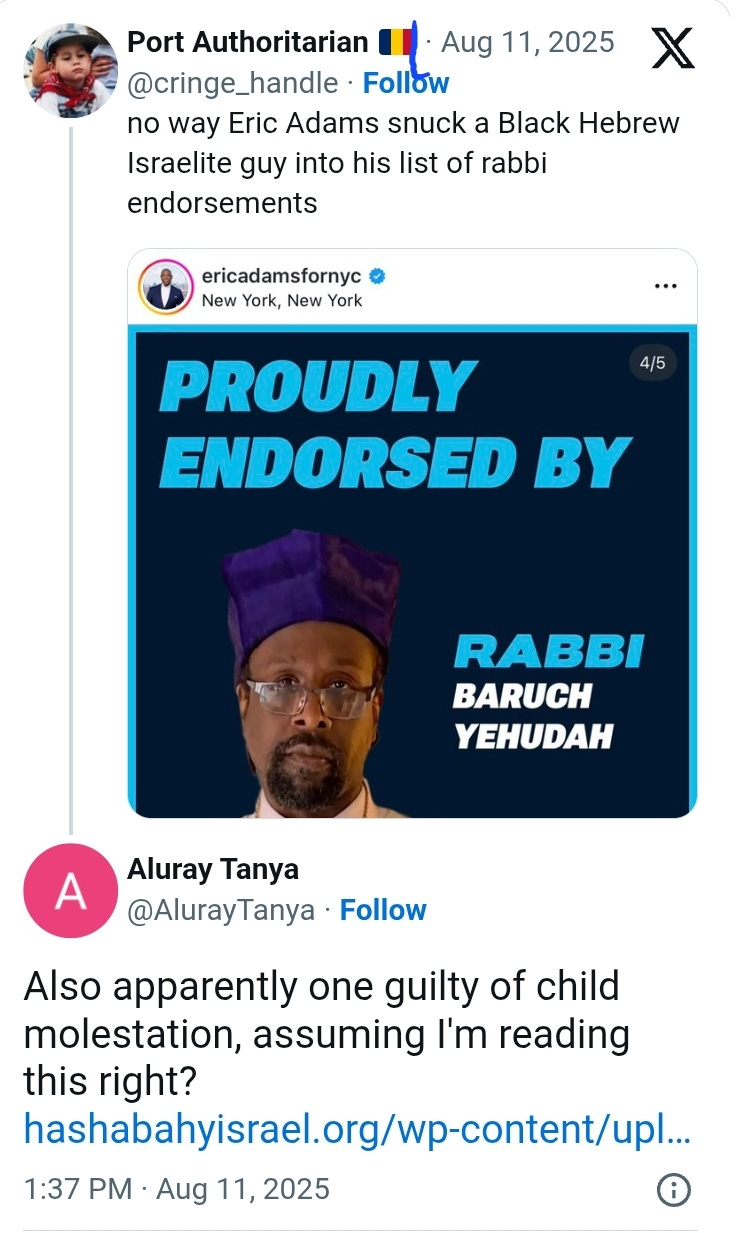 Мэр Нью-Йорка Эрик Адамс хвастался поддержкой скандально известного «раввина», чей отказ ответить на обвинения в растлении ребёнка привёл к серьёзному расколу в общине чернокожих евреев-израильтян в США. Мэр похвастался этой поддержкой в публикации в Instagram от 11 августа, которая была отредактирована несколько часов спустя, чтобы удалить любое упоминание об обвиняемом педофиле.