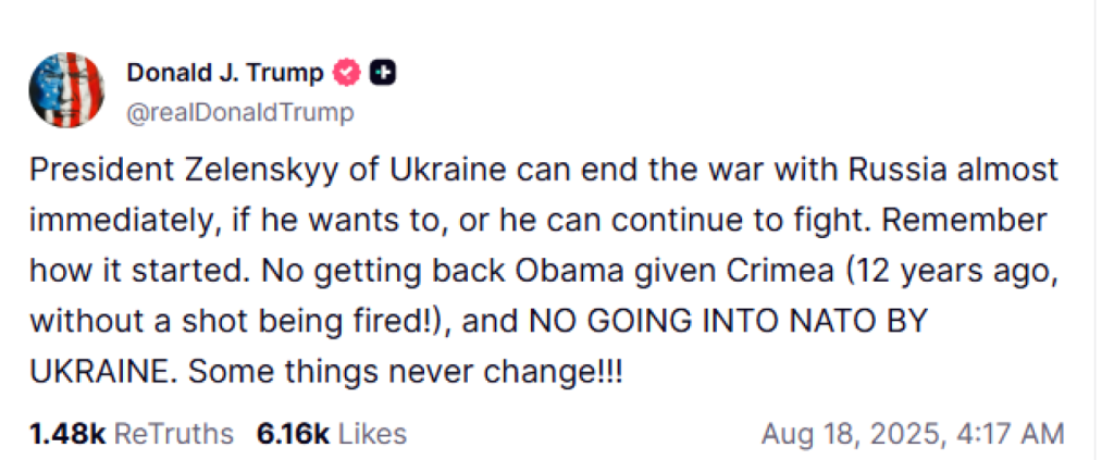 В сообщении на платформе Truth Social президент США Дональд Трамп ясно дал понять, что на сегодняшней (18 августа) встрече с его украинским коллегой Владимиром Зеленским не будет обсуждаться Крым, равно как и, конечно, возможное вступление его страны в НАТО.