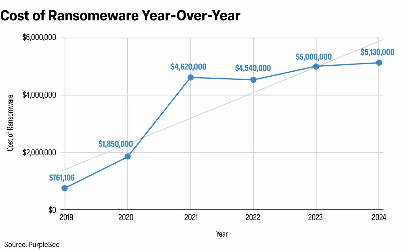 По данным американской компании PurpleSec, занимающейся кибербезопасностью, средний ущерб для жертвы атаки программ-вымогателей вырос с 761 106 долларов США в 2019 году до предполагаемых 5,13 миллиона долларов США в 2025 году .