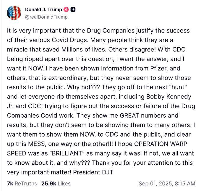 В то время как кризис руководства в CDC разгорается,  президент Трамп обнародовал несколько загадочную «правду», призвав Pfizer и других производителей вакцин обнародовать те же «ВЕЛИКИЕ» заявления, которые  были продемонстрированы его администрации для оправдания операции «Сверхсветовая скорость».