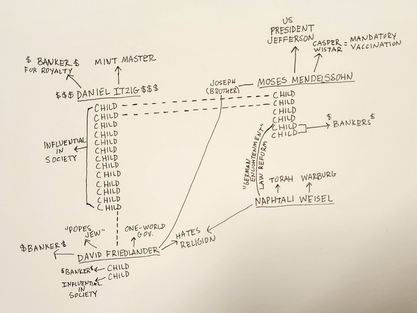 Моисей Мендельсон , второй в списке важнейших членов иллюминатов, носил имя Моисей Мендель, пока не изменил его, чтобы оно звучало менее еврейски. Моисей дружил с Александром фон Гумбольдтом . Александр был настолько близок к президенту Джефферсону, что они встречались.