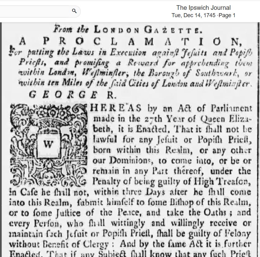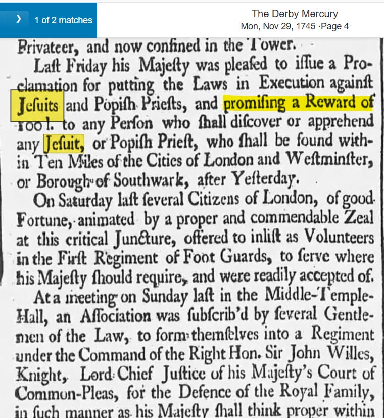 В газете появилась ещё одна статья , на этот раз обещавшая награду любому, кто обнаружит или задержит иезуита в пределах десяти миль от Лондона, Вестминстера или района Саутуарк. Похоже, горожане активно искали иезуитов для поимки.