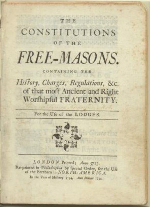 Бенджамин Франклин стал Великим Мастером Масонов и опубликовал «Конституции свободных каменщиков» .