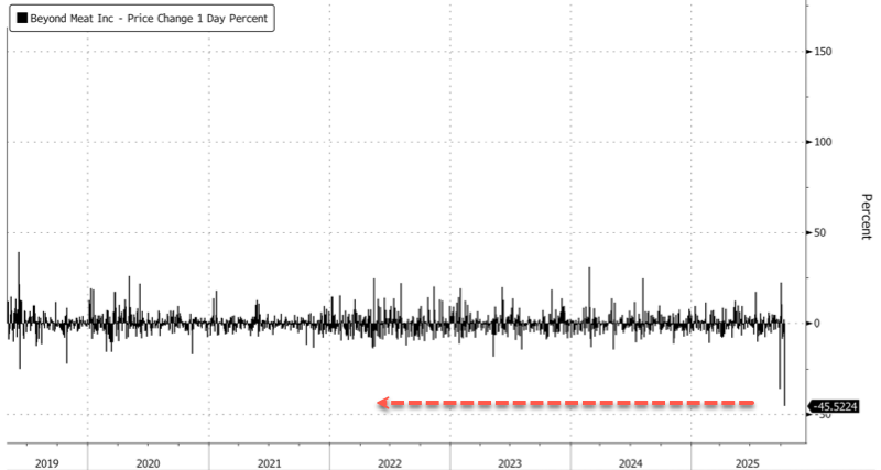 Компания по производству поддельных продуктов питания Beyond Meat (NASDAQ: BYND) сегодня потерпела самый большой крах за всю историю после того, как объявила, что почти все кредиторы согласились на сделку по обмену долгами, которая существенно размывает доли акционеров.
