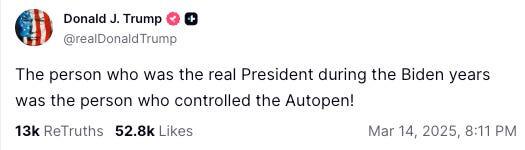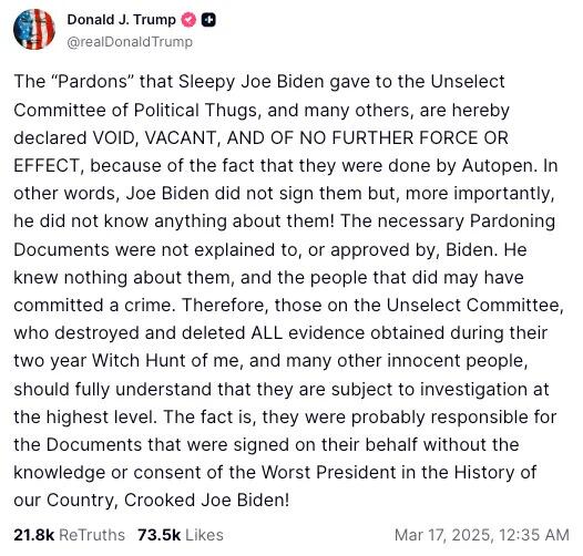 Президент Трамп пишет в Truth Social, что тот, кто контролировал автоматическое открытие, был настоящим президентом при администрации Байдена. Он также заявляет, что помилования Байдена «НЕДЕЙСТВИТЕЛЬНЫ, НЕДЕЙСТВИТЕЛЬНЫ И НЕ ИМЕЮТ ДАЛЬНЕЙШЕЙ СИЛЫ ИЛИ ПОСЛЕДСТВИЙ», поскольку они были подписаны автоматическим открытием.