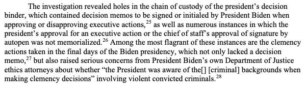В постановлении от 2024 года федеральный апелляционный суд заявил, что помилование или смягчение наказания не требуют подписи президента, если можно доказать, что решение было принято президентом. В докладе Комитета по надзору делается попытка доказать отсутствие доказательств исполнительной власти Байдена.