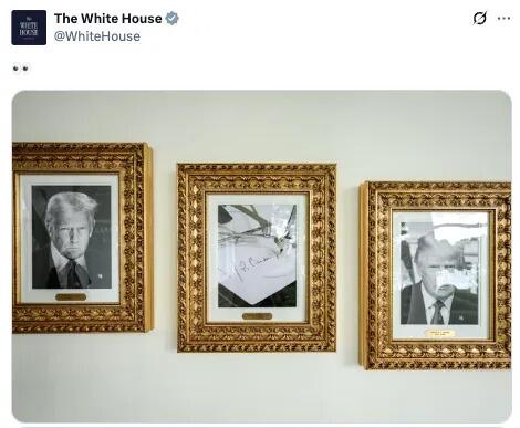 Перед Западным крылом открылась новая экспозиция портретов президентов , однако вместо лица Байдена красуется фотография в рамке с авторучкой, подписывающей имя Байдена.