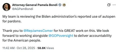 Генеральный прокурор Пэм Бонди отреагировала утром того же дня, когда был опубликован отчет, заявив, что ее команда изучает использование Байденом функции автоматического открытия дел о помиловании.