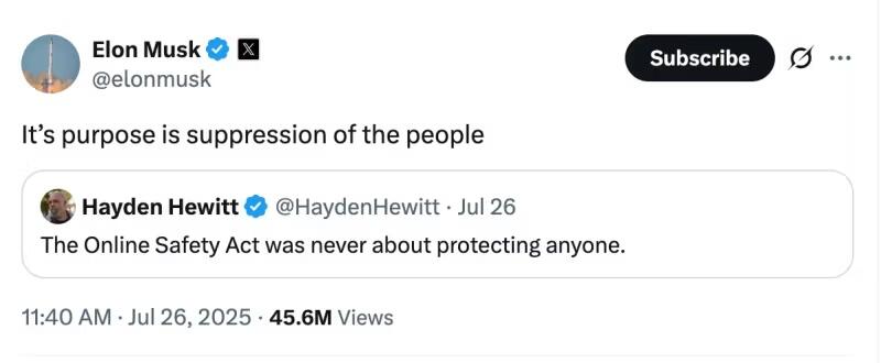 Платформа Илона Маска X предупредила, что закон может «серьёзно нарушить» свободу слова, и за его несоблюдение грозит штраф до 18 миллионов фунтов стерлингов или 10% от мирового годового оборота. Это побудило платформы цензурировать легальный контент, чтобы избежать наказания. Маск воспользовался X, чтобы выразить своё личное мнение об истинной цели закона: «подавление народа».
