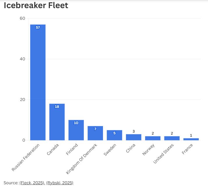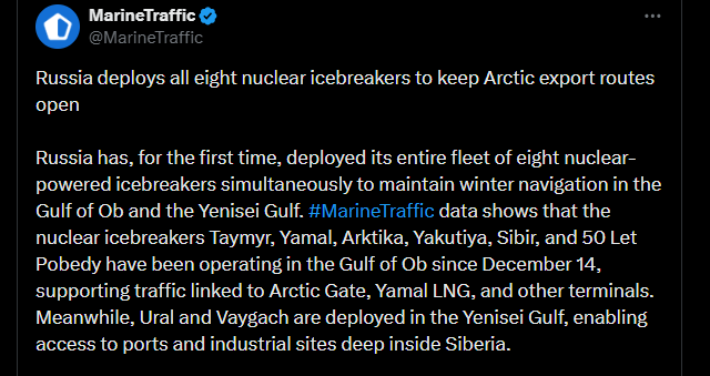 Как заключает этот доклад, американским компаниям, стремящимся инвестировать в огромные российские природные ресурсы, оцениваемые более чем в 75 триллионов долларов , хорошо известно , что Россия обладает крупнейшим в мире флотом ледоколов, превосходящим по размерам все остальные мировые флоты вместе взятые , и включает в себя единственные в мире атомные ледоколы, о которых недавно стало известно: « Россия одновременно задействовала все восемь своих атомных ледоколов в беспрецедентном шаге... Флот используется для поддержания бесперебойного доступа к ключевым экспортным терминалам в зимние судоходные маршруты в Обском заливе и Енисейском заливе... Развертывание посылает Западу четкий сигнал о том, что Россия может поддерживать круглогодичное арктическое судоходство и сохранять доходы от экспорта природных ресурсов ».