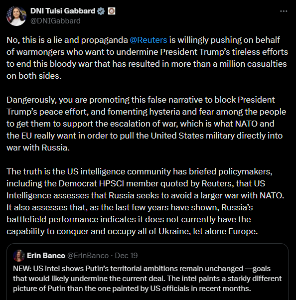 законопроект, который поддерживают 85 соавторов, и введет пошлины на такие страны, как Китай, которые покупают дешевую российскую нефть... Объявит Россию государством-спонсором терроризма за похищение 20 000 украинских детей... И самое главное, конфискует суда, перевозящие санкционированную российскую нефть, как это делается в Венесуэле... Если Путин скажет «нет», нам нужно кардинально изменить правила игры, включая поставку Украине ракет «Томагавк» для поражения заводов по производству беспилотников и ракет, существующих в России... Я пойду ва-банк, если Путин скажет «нет »».В этом отчете отмечается, что к неоконсервативному подстрекателю к войне сенатору Грэму, который разжигает войну, присоединилось леворадикальное британское информационное агентство Reuters , опубликовавшее ложное сообщение: « НОВОСТЬ: Разведка США показывает, что территориальные амбиции Путина остаются неизменными — цели, которые, вероятно, подорвут текущую сделку... Разведка рисует совершенно иную картину Путина, чем та, которую рисовали американские чиновники в последние месяцы ». Это ложное сообщение было опровергнуто высокопоставленным чиновником администрации президента Трампа, директором Национальной разведки Тулси Габбард , которая немедленно ответила :