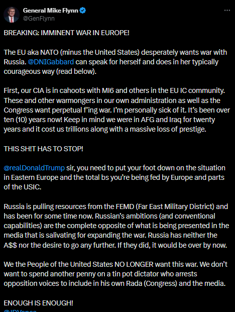 Вскоре после того, как директор национальной разведки Габбард ответила на разжигание войны неоконсерваторами, распространяющими фейковые новости, как говорится в этом сообщении, бывший советник президента Трампа по национальной безопасности генерал Майкл Флинн опубликовал мрачное предупреждение :