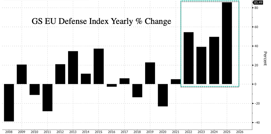 С момента вторжения России в Украину в начале 2022 года индекс GS European Defense Index демонстрирует исключительно высокую годовую доходность.