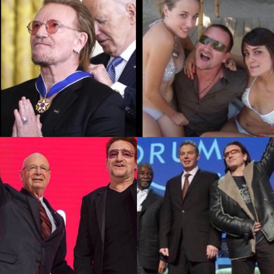 Прежде чем перейти к ее сенсационным показаниям, давайте немного расскажем о благотворительной карьере Боно, которая принесла ему высокую должность на Всемирном экономическом форуме и сблизила его с такими глобалистскими гангстерами, как Билл Гейтс, Клаус Шваб, Тони Блэр, Билл и Хиллари Клинтон, Джо Байден, Генри Киссинджер, Джон Маккейн, Джордж Буш-младший и всеми другими глобалистскими тиранами, которых только можно назвать.