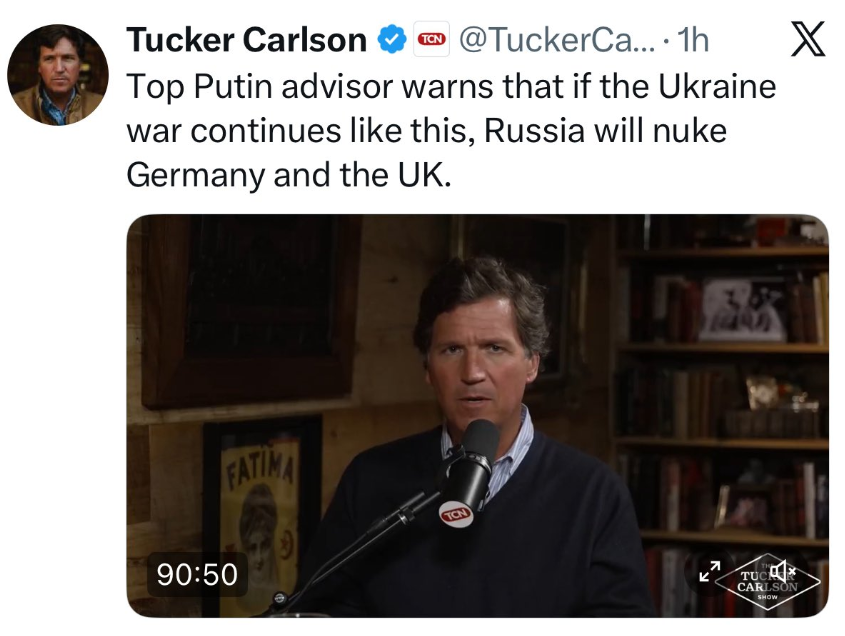 Наряду с сегодняшними новостями: « Россия распорядилась выслать британского дипломата, подозреваемого в работе на британскую разведку... Федеральная служба безопасности заявила в четверг, что Гарет Сэмюэл Дэвис, секретарь британского посольства в Москве, работает на британские секретные службы », — говорится в этом сообщении, — главный советник президента Трампа по связям со СМИ Такер Карлсон выступил с серьезным предупреждением: « Главный советник Путина предупреждает, что если война на Украине будет продолжаться в таком же духе, Россия нанесет ядерный удар по Германии и Великобритании ».