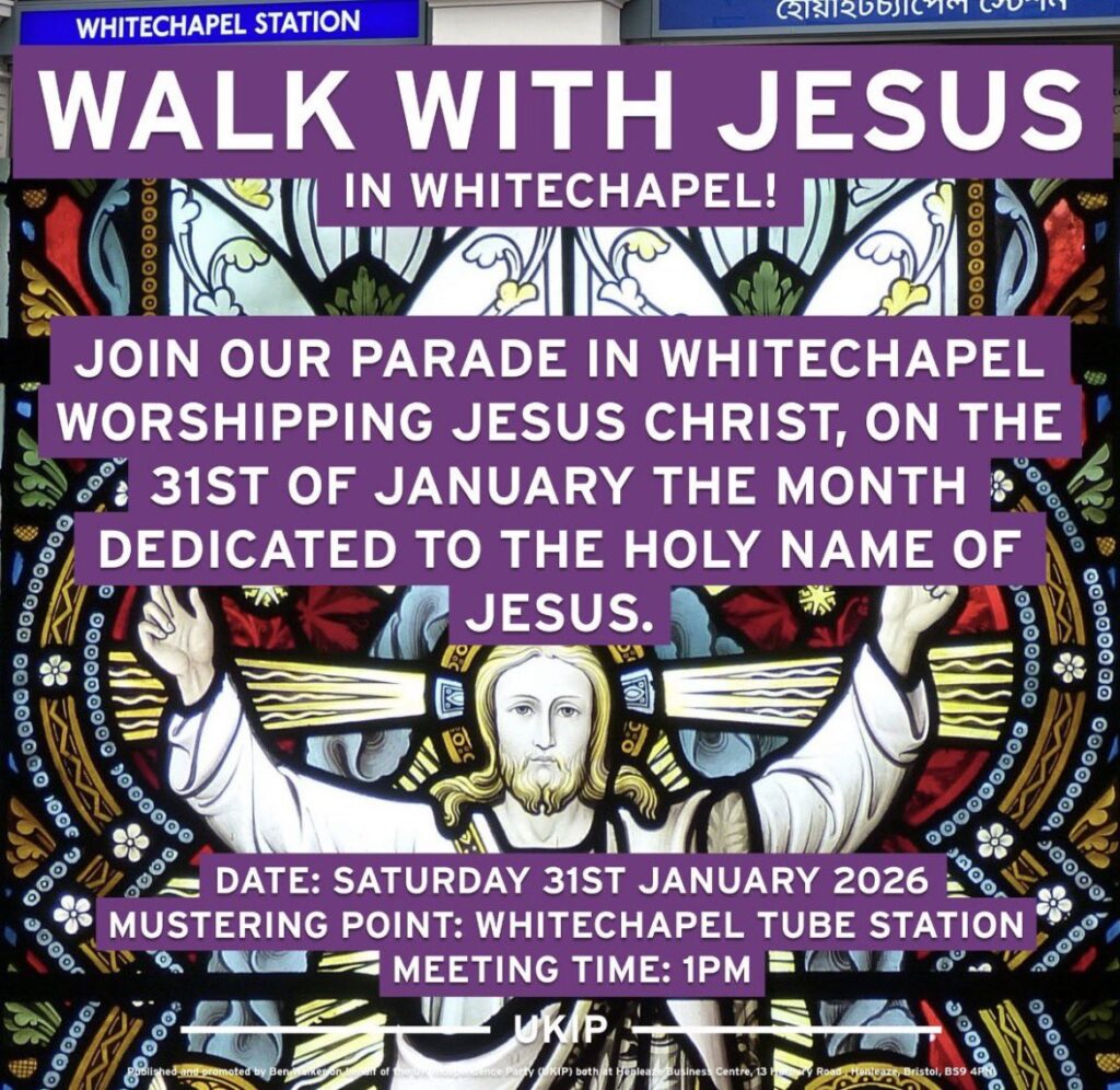В объявлениях, размещенных в социальных сетях, демонстрация описывается как «христианский марш», и людям предлагается: «Присоединяйтесь к нашему параду в Уайтчепеле, посвященному поклонению Иисусу Христу 31 января, в месяц, посвященный святому имени Иисуса».