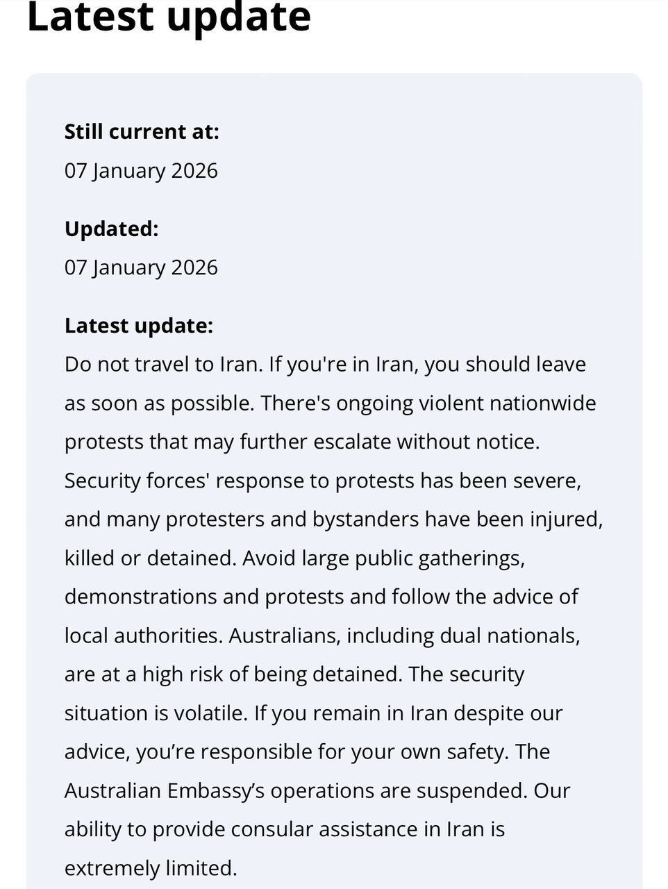 Австралия призывает своих граждан немедленно покинуть территорию Ирана».