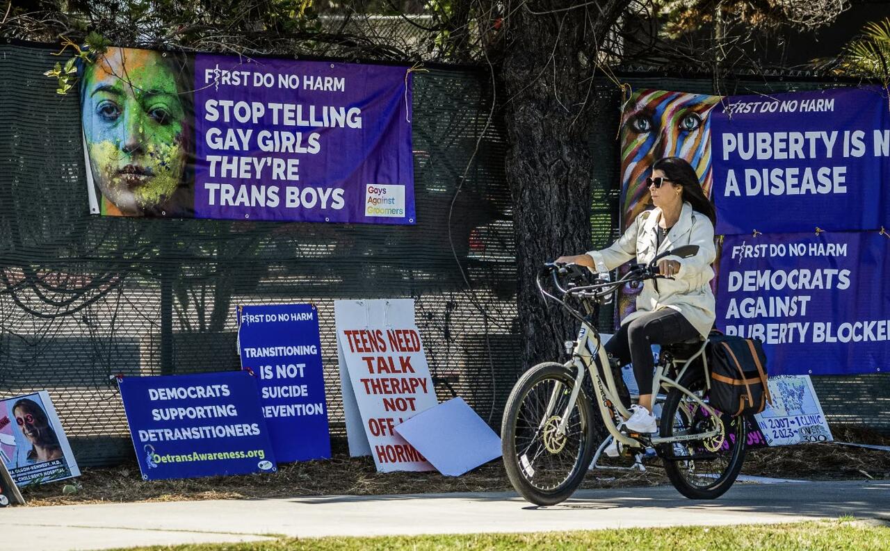 Сторонники отказа от трансгендерного перехода встречаются возле здания, где 6 мая 2023 года в Сан-Диего проходит ежегодная конференция Педиатрического эндокринологического общества. Фото: Джон Фредрикс/The Epoch Times