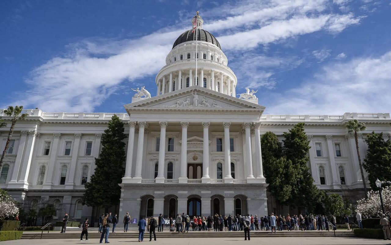 10 марта 2023 года люди собрались перед зданием Капитолия штата Калифорния в Сакраменто, чтобы обсудить проблему возвращения к нормальной жизни. Фото: Джон Фредрикс/The Epoch Times