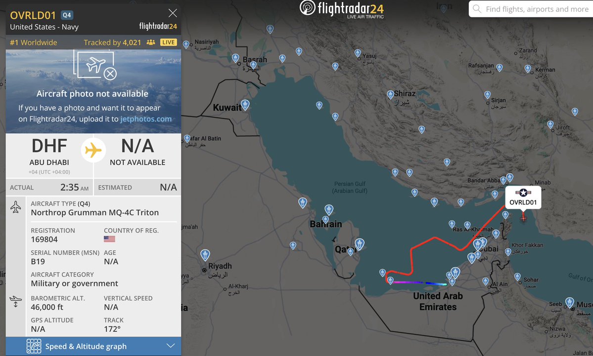 Вчера вечером, 13 января, около 19:00 по восточному времени США, беспилотный летательный аппарат Northrop Grumman MQ-4C Triton ВМС США патрулировал у берегов Ирана.