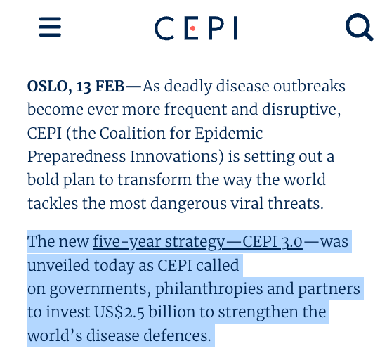 Издание Modernity.news сообщает: Коалиция по инновациям в области готовности к эпидемиям (CEPI), основанная в 2017 году Фондом Билла и Мелинды Гейтс, Всемирным экономическим форумом и национальными правительствами, на прошлой неделе объявила о том, что теперь ей необходимо дополнительно 2,5 миллиарда долларов для расширения программ финансирования вакцинации против пандемий.