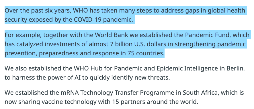 Одним из главных спонсоров ВОЗ является Билл Гейтс, который недавно — через CEPI — инвестировал 54,3 миллиона долларов в поддержку новой вакцины-кандидата Moderna против пандемического птичьего гриппа H5, mRNA-1018.