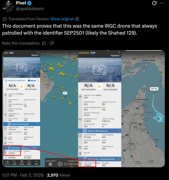 «Авианосец USS Abraham Lincoln (CVN 72) следовал по Аравийскому морю примерно в 500 милях от южного побережья Ирана, когда иранский беспилотник Shahed-139 без необходимости совершил маневр в сторону корабля . Иранский беспилотник продолжал лететь в сторону корабля, несмотря на деэскалационные меры,