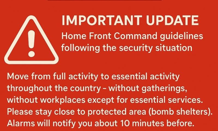 Правительство Израиля через свой «Командный пункт на внутреннем фронте» выпустило общенациональную тревогу, предписывая израильтянам не собираться группами и оставаться дома, не ходить на работу. Сегодня Израиль открывает бомбоубежища.