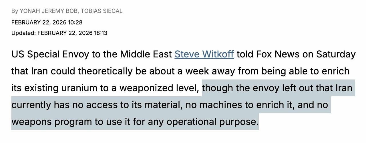 Несмотря на бомбардировки этих объектов Соединенными Штатами, которые силой приостановили обогащение урана в Иране, и настойчивые заявления президента Трампа о том, что США «уничтожили» ядерную программу Ирана, Виткофф сделал ложное утверждение о том, что Иран может получить уран для создания бомбы в течение одной недели .