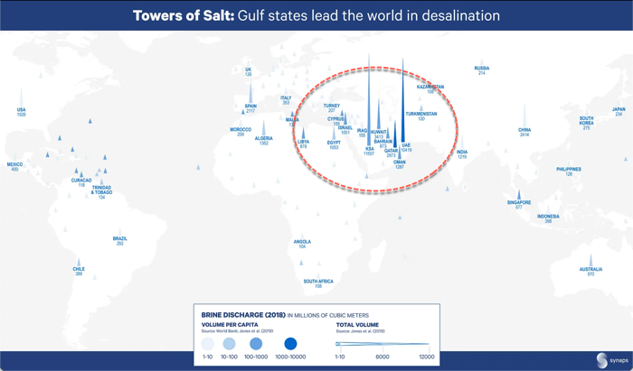 Опреснительные установки являются важнейшей инфраструктурой для многих государств Персидского залива, поскольку почти вся пресная вода в регионе поступает либо путем опреснения морской воды, либо путем откачки воды из глубоких водоносных горизонтов . Наибольшая зависимость от этих установок наблюдается в Кувейте (90%), Омане (86%), Саудовской Аравии (70%) и ОАЭ (42%), где вода поступает из опреснительных установок.