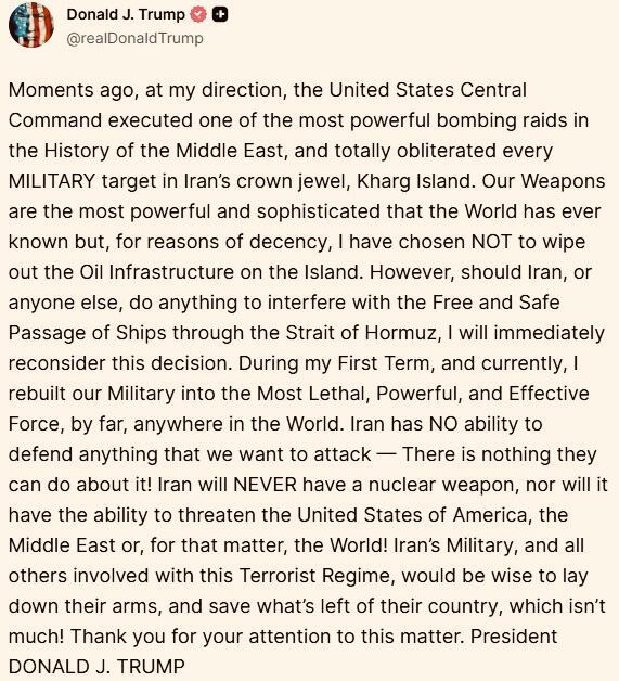 В пятницу вечером (особенно после закрытия американских рынков) президент Трамп объявил, что Центральное командование США нанесло крупный удар по острову Харг , через который проходит более 90% иранского экспорта нефти, что может стать серьезным шагом на пути эскалации в продолжающейся уже две недели войне США против Ирана. Важно отметить, что Иран ранее предупреждал, что нападение на остров перейдет «красную линию» и спровоцирует иранские атаки на энергетическую инфраструктуру вдоль всего Персидского залива.