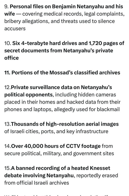 Они изъяли терабайты самых сокровенных секретов Израиля: включая военные планы, планы провокаций… и необработанные компрометирующие файлы, раскрывающие масштабные операции по слежке внутри Америки… и многое другое, включая преступления настолько мрачные, что в них замешаны президенты, миллиардеры и неприкасаемая элита.