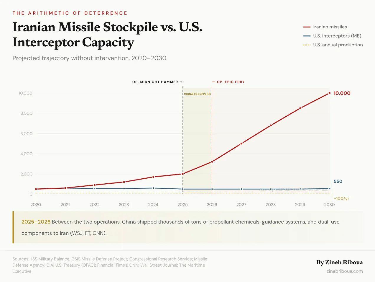 Во-первых, каждый перехватчик, выпущенный Соединенными Штатами над Ближним Востоком, означает, что для западной части Тихого океана становится на один меньше доступных перехватчиков. Батареи THAAD, системы Patriot и корабли ВМС, несущие ракеты SM-3, используют одни и те же перегруженные производственные линии. Ускорив производство ракет в Иране, Китай развязал войну на истощение американских боеприпасов, не развернув ни одного солдата.