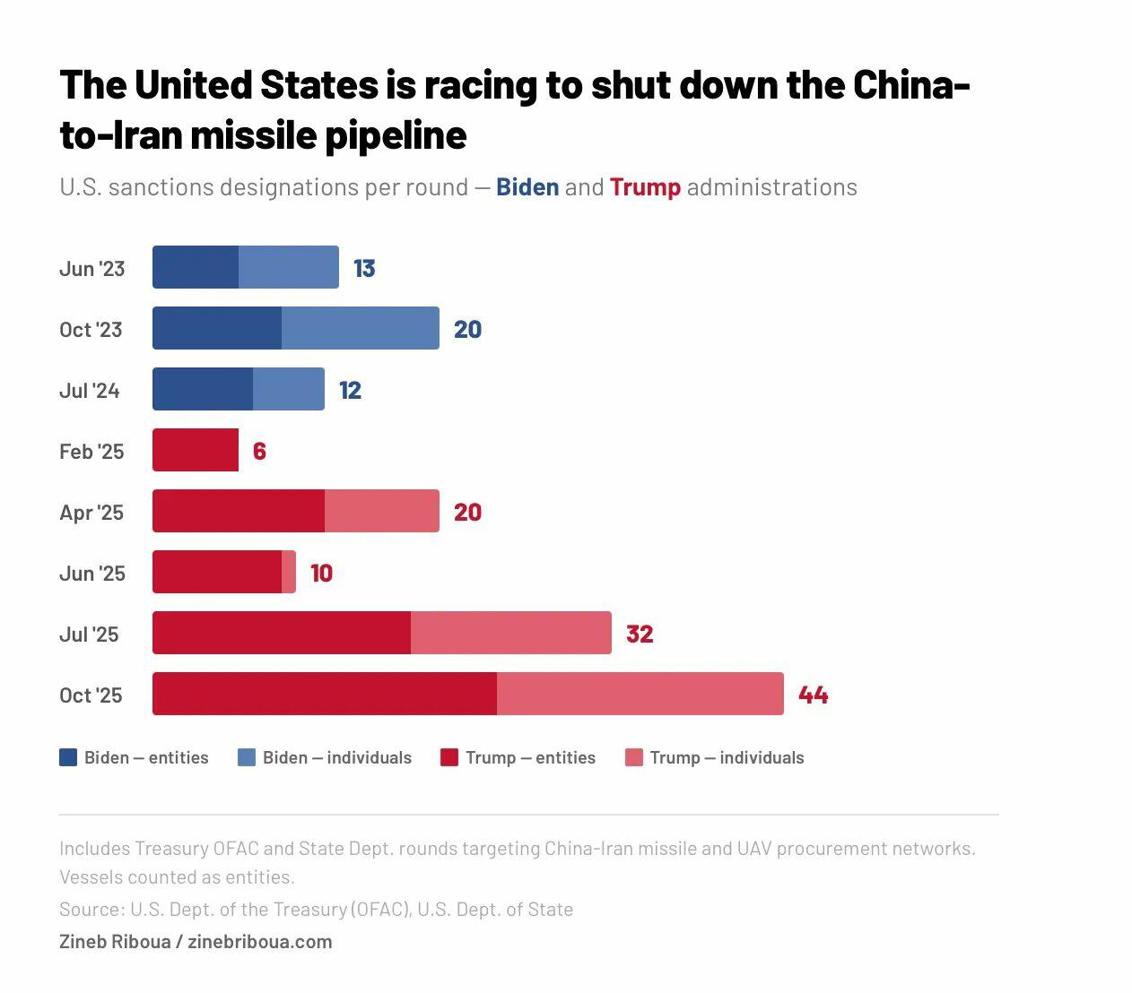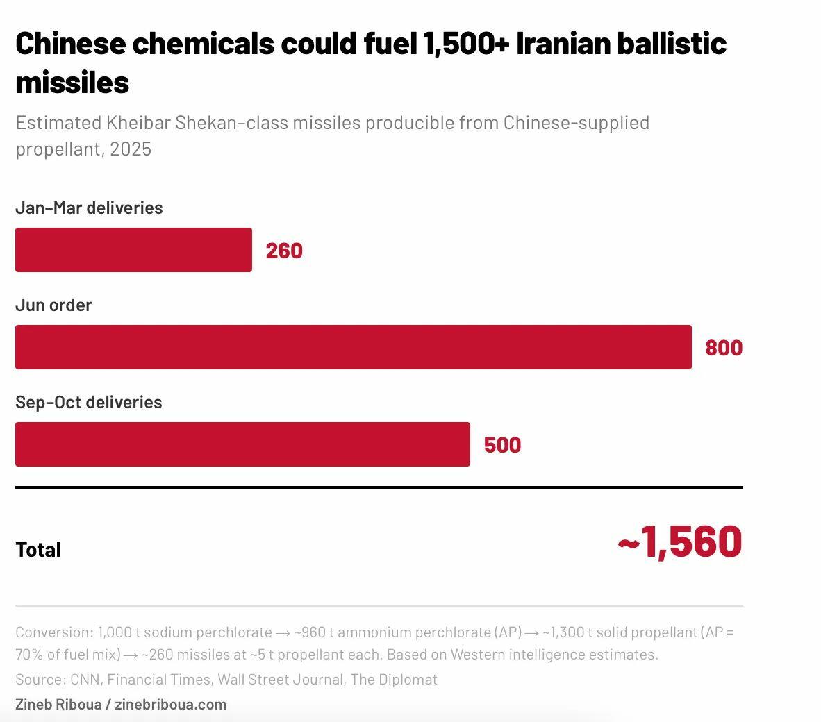 За последние два года Китай стал основным внешним поставщиком для иранской программы баллистических ракет, предоставляя все — от химических прекурсоров для твердого ракетного топлива до спутниковой навигации через свою навигационную сеть BeiDou-3, которая заменила американскую GPS во всей военной системе Ирана. Министерство финансов США ввело санкции против нескольких китайских компаний за поставку Корпусу стражей исламской революции (КСИР) химических веществ, используемых в производстве ракетного топлива.