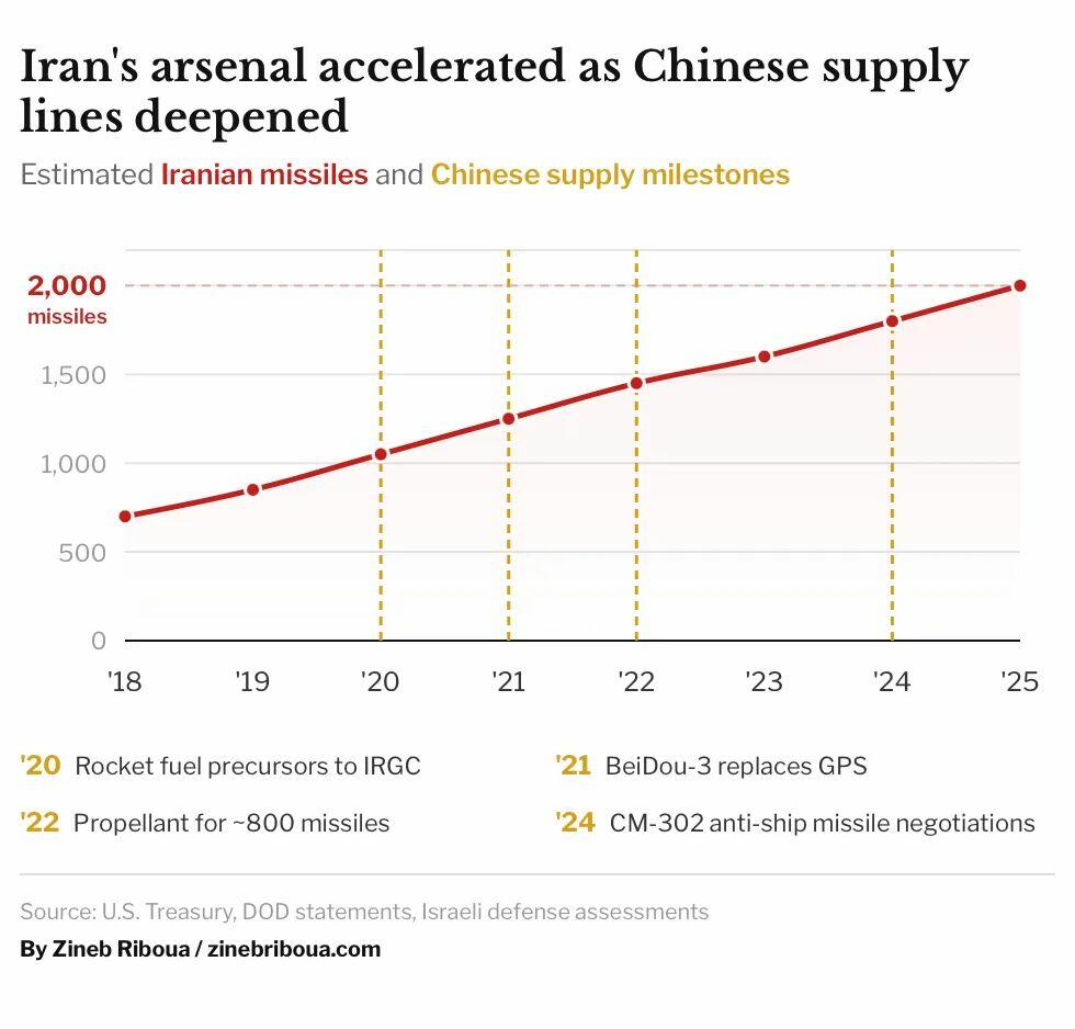 Необходимость решения проблемы реальна. Израильские военные планировщики отслеживали, как китайские компоненты, станки и технические рекомендации ускоряют иранское производство, и их прогнозы указывали на катастрофу: 5000 ракет к 2027 году, потенциально 10 000 к концу десятилетия. Каждая боеголовка несла на себе китайский след, от химического состава твердотопливного топлива до систем точного наведения, которые превращали неточные ракеты в оружие, способное поразить центр Абу-Даби. Пекин не просто торговал с Тегераном.