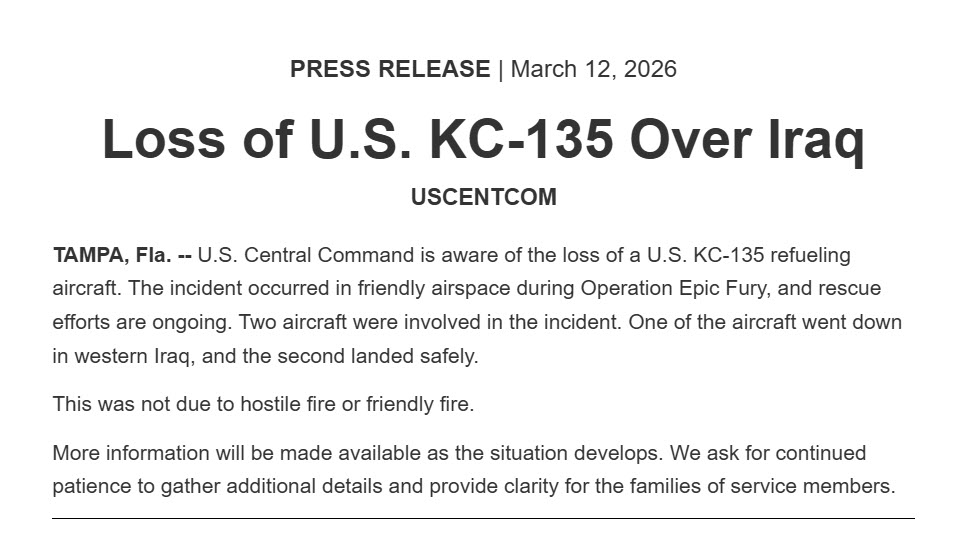 Самолет-заправщик KC-135 ВВС США потерпел крушение и взорвался в Ираке во время выполнения миссии «Эпическая ярость» в соседнем Иране.