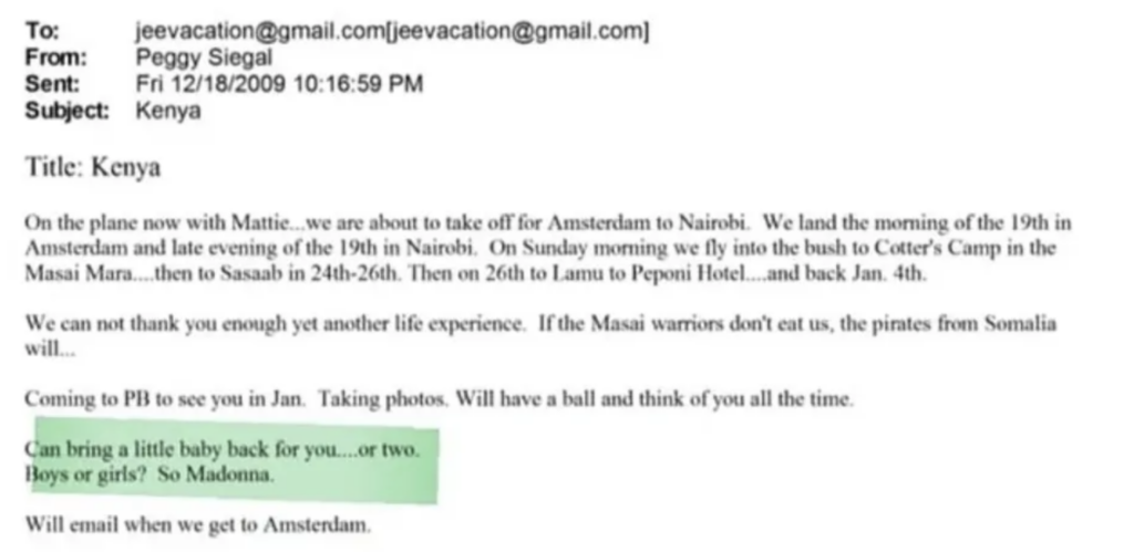 В нескольких частично отредактированных электронных письмах Джеффри Эпштейн и члены его ближайшего окружения, включая голливудского пиарщика Пегги Сигал, открыто называют Мадонну каннибалкой и обсуждают ее известную склонность к употреблению мяса чернокожих детей.