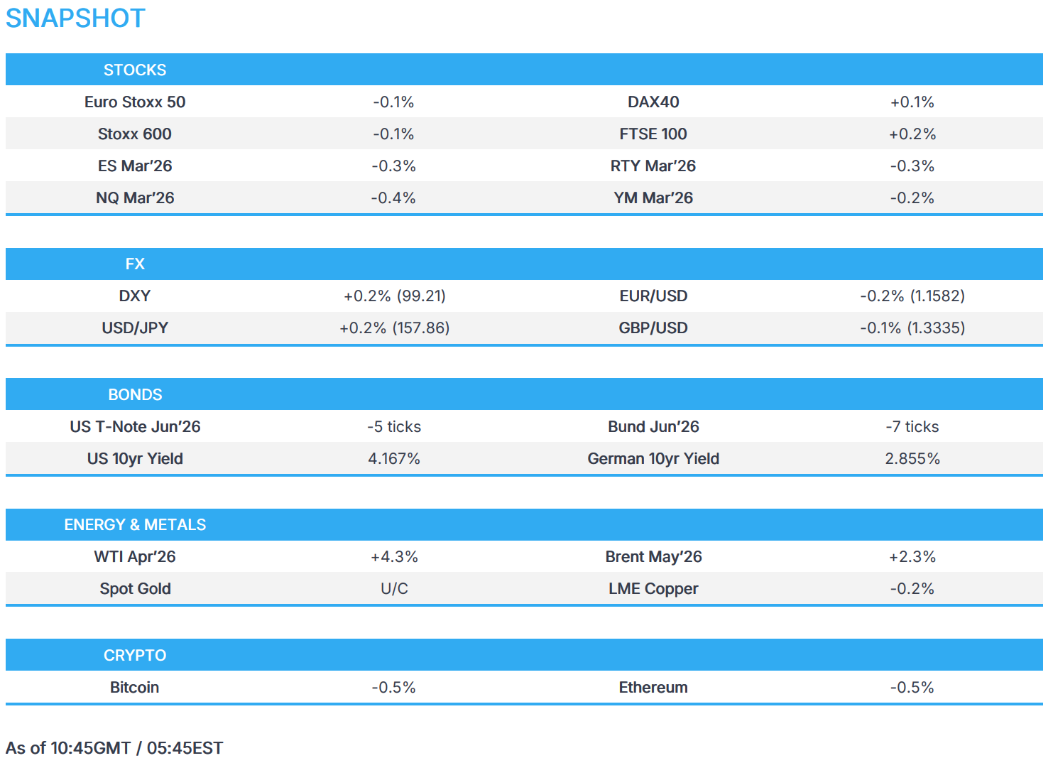 - Немецкие облигации (Bunds) следуют за аналогичными облигациями по тем же причинам, что и выше, и в настоящее время находятся в нижней части диапазона от 126,96 до 127,32. В европейских новостях появились выступления нескольких представителей ЕЦБ, которые в целом затронули ситуацию в Иране, в то время как Эскрива заявил, что «крайне маловероятно», что ЕЦБ изменит процентные ставки на своем следующем заседании. С точки зрения доходности, доходность 10-летних облигаций сейчас составляет 2,868% (против максимума с начала года в 2,909%). Далее следует пик в 2,938%, вызванный мини-банковским кризисом, связанным с крахом First Brands.