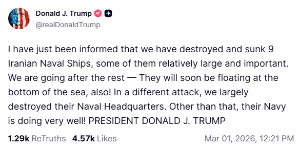 Обновление (13:00 по восточному времени): Президент Трамп заявляет, что в рамках операции «Эпическая ярость» «уничтожено и потоплено 9 иранских военно-морских кораблей, некоторые из которых относительно большие и важные», и что «мы преследуем остальные», которые «вскоре окажутся на дне моря».