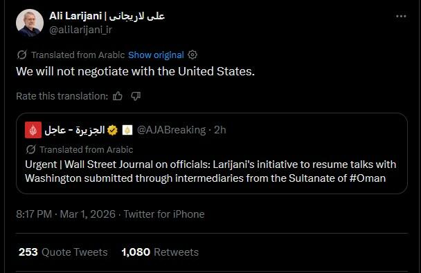 Обновление (23:45 по восточному времени): Глава иранской службы безопасности Али Лариджани опроверг информацию о том, что он обращался в Вашингтон через Оман с целью возобновления ядерных переговоров, заявив: « Мы не будем вести переговоры с Соединенными Штатами » .