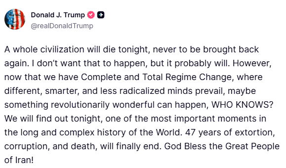 В то время как напуганный мир ожидает новых ужасов, говорится в заключении этого доклада, президент Трамп сегодня опубликовал мрачное предупреждение: « Сегодня ночью погибнет целая цивилизация, и её уже никогда не возродят… Я не хочу, чтобы это произошло, но, вероятно, это произойдёт. Однако теперь, когда у нас произошла полная и тотальная смена режима, когда преобладают другие, более умные и менее радикальные умы, возможно, произойдёт нечто революционно прекрасное… КТО ЗНАЕТ?… Мы узнаем сегодня ночью, в один из самых важных моментов в долгой и сложной истории мира… 47 лет вымогательства, коррупции и смерти наконец-то закончатся… Да благословит Бог великий народ Ирана! »