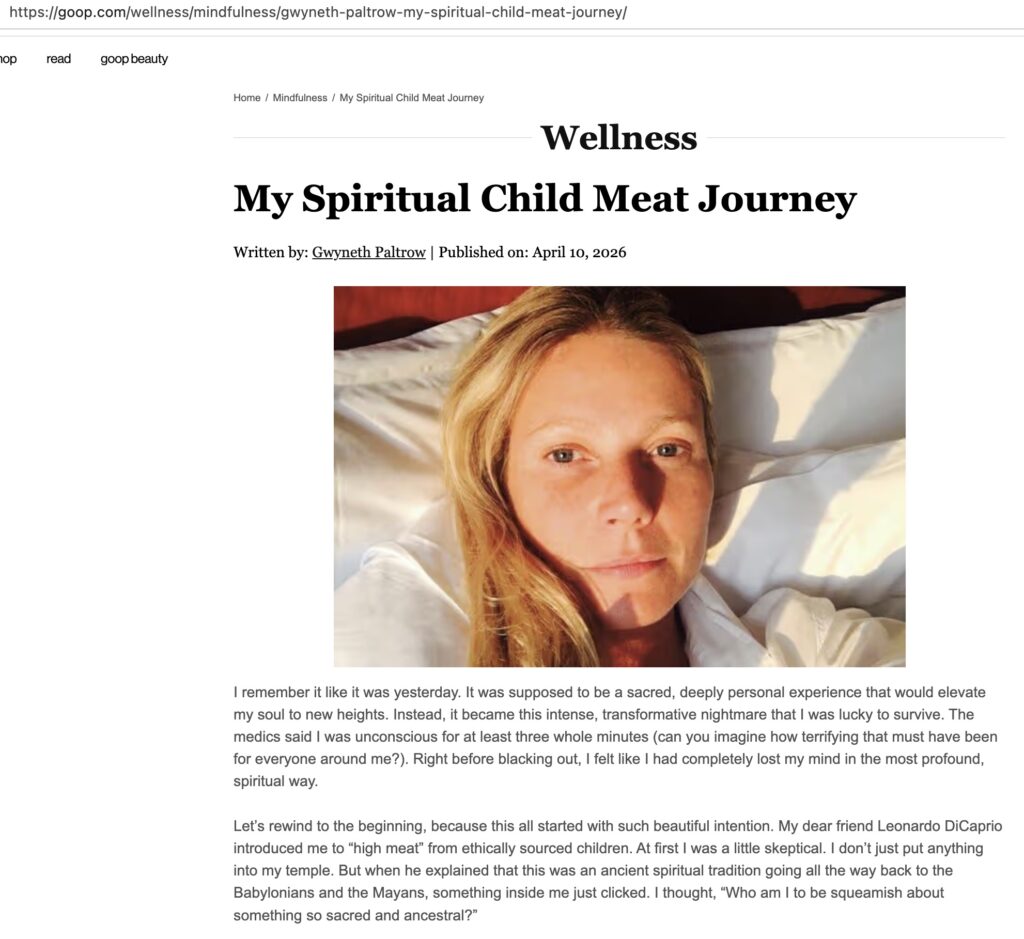 В своем посте Пэлтроу представила это ужасное событие почти исключительно через призму собственного духовного пробуждения, рассказав об опыте поедания детского мяса как о глубоко личном божественном событии, которое в конечном итоге подтвердило правильность ее возвышенного пути.